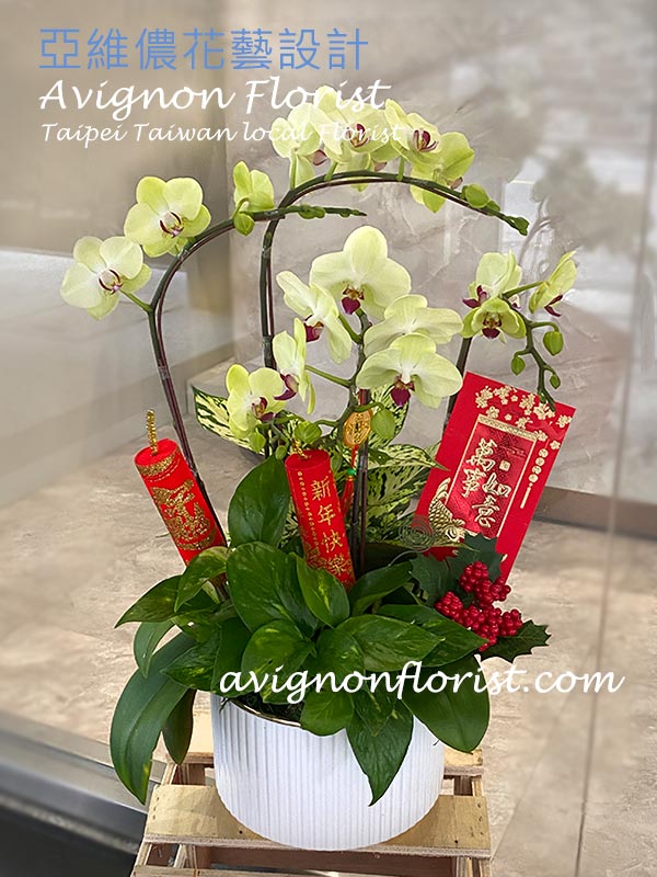 This small-medium orchid arrangement features four graceful stems of green-apple–colored Butterfly Orchids (Phalaenopsis), offering a fresh, modern look with a light and uplifting presence. The soft green tones feel clean and contemporary, making this orchid especially versatile for both home and office settings. Its more compact scale makes it easy to place, visually balanced, and ideal for spaces where a touch of elegance is desired without overwhelming the room. A tasteful choice for everyday enjoyment or thoughtful gifting.