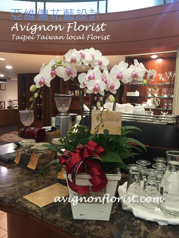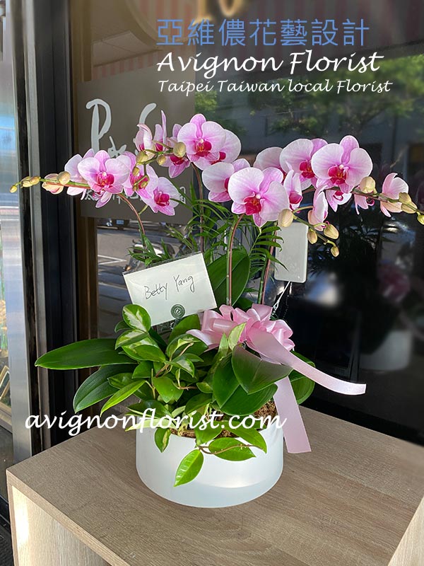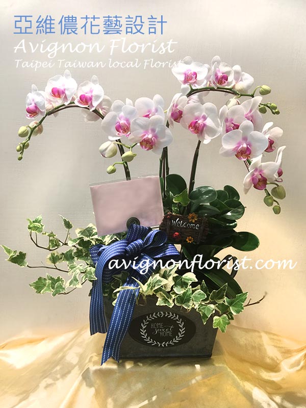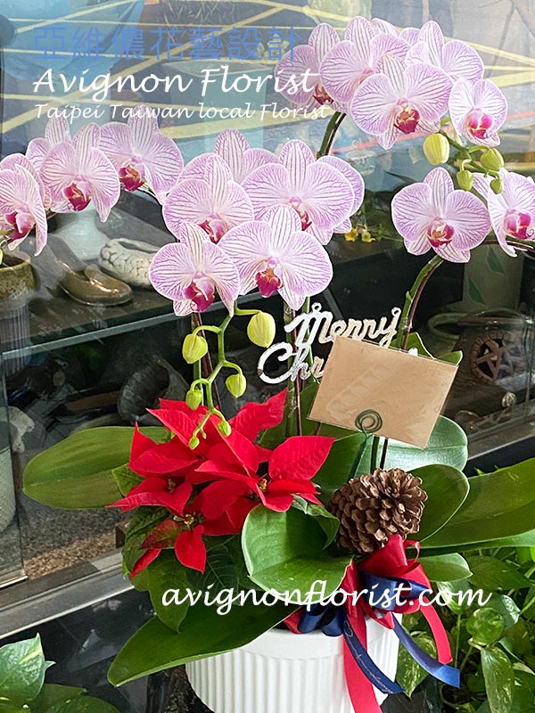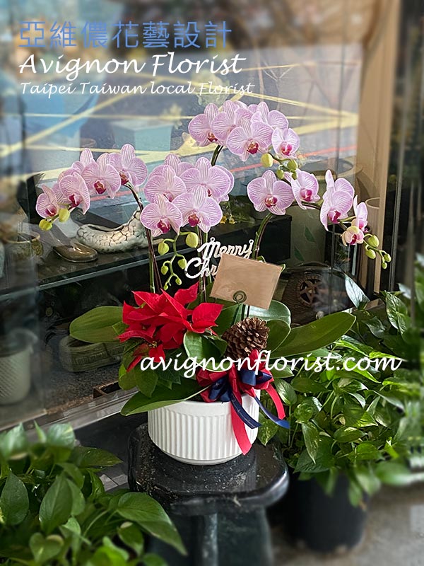 Notes: Orchid color and style may vary. Decorations can be used to suit the occasion or season (Christmas/ Lunar New Year/ non-holiday, etc.) This is the smaller variety of butterfly orchids. The approximate height of the arrangement including the pot is approximately 40-50 cm.