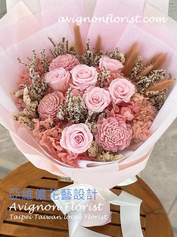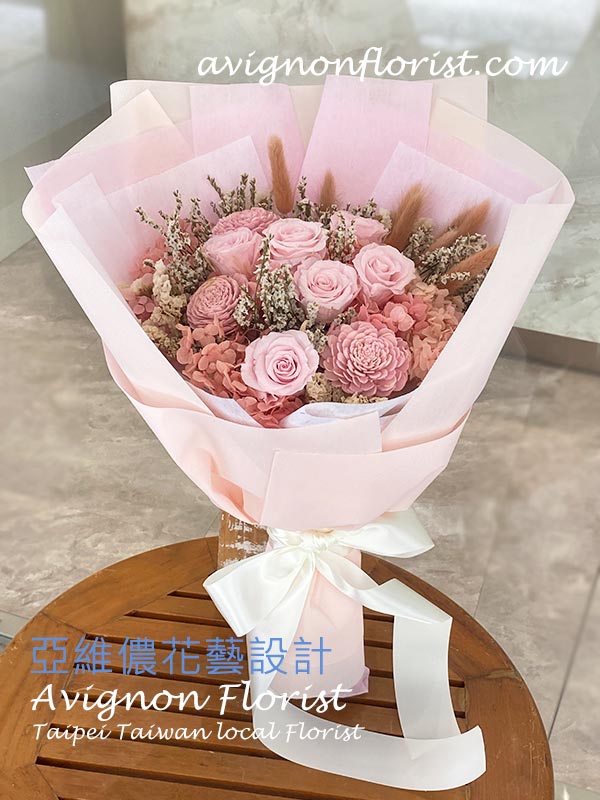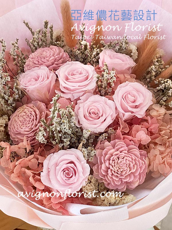 天使心~~粉玫瑰永生花束~~ Forever Roses 美麗溫柔的粉色玫瑰和繡球花,編織一幅令人愉悅的畫面 像一首詩令人陶醉…..。使用日本進口的 EARTH MATTERS大地 玫瑰永生花材,搭配繡球花及其他不凋花材料作設計,玫瑰每朵花面尺寸約5cm,作品 尺寸大約 size: W33 *H46 cm。(需要提前2個工作天預約訂購.)
