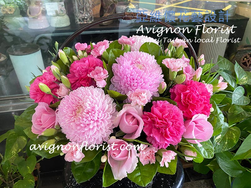 真誠祝福花籃以粉色系花材為主,搭配康乃馨、玫瑰與菊花,呈現溫和而大方的桌上型花禮。整體風格親切不張揚,適合在重要節日向家人傳達心意,也可作為日常關懷與感謝的貼心選擇。
